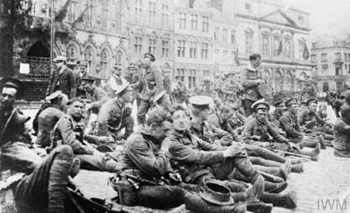 · The soldiers sitting in the Grand Place look exhausted, there is no sign of their packs, rifles close at hand, and many are carrying additional bandoliers of ammunition, something unnecessary on the Saturday when marching to the canal.