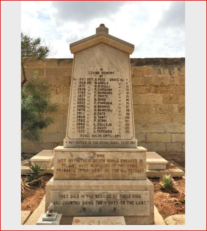 The Memorial to the fatalities of the explosion of 5 October 1915. All but 2 are buried in the Naval Cemetery, Kalkara, Malta. https://www.facebook.com/combatarchives