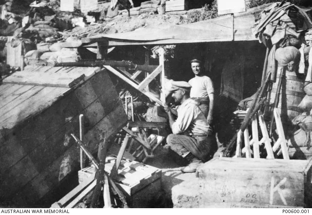Sargeant Beech testing one of his periscopic rifles in his workshop on the beach at Anzac Cove, 1915. Australian War Memorial P00600.001