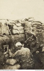 Members of the 20th Battalion in a trench at Gallipoli. One soldier is spotting the enemy whilst another prepares to throw a stick grenade.