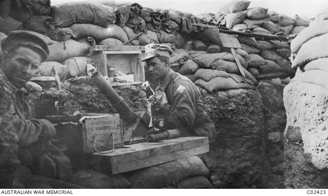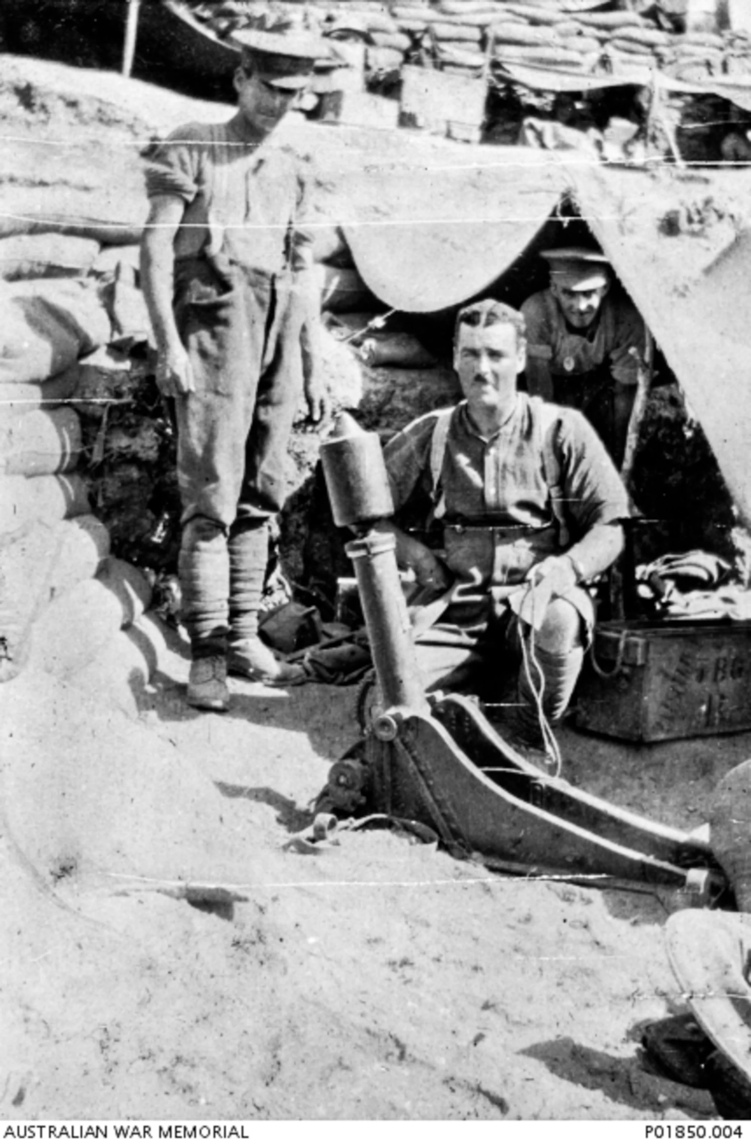 A member of the 28th Battalion fires a trench mortar in a front line trench on the Apex, Gallipoli. Note the Garland bomb on the wooden platform.