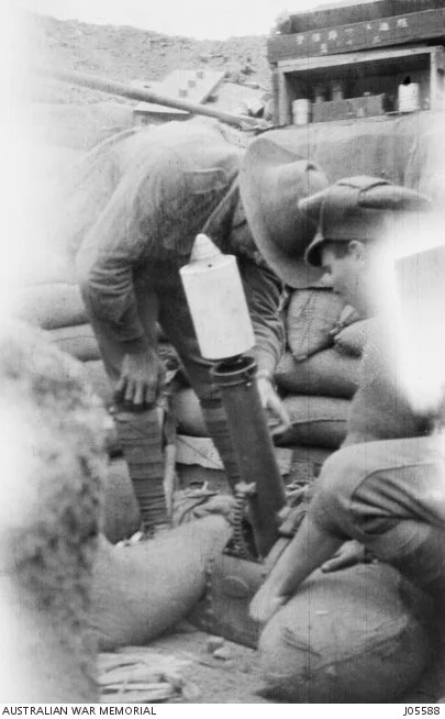An Australian mortar bomb team preparing to fire a Japanese mortar. The soldier in the centre is holding the firing lanyard. Australian War Museum P01850.004
